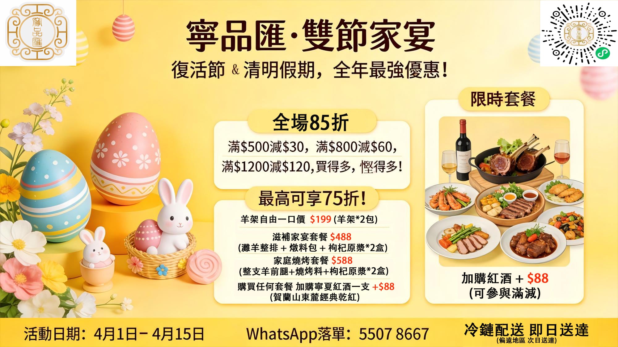 NingxiaUPPC簡介 寧夏灘羊肉質細嫩、脂肪低、無羶味,含有八種無法人工合成的聚合生長、中鏈生長和風味生長。灘羊肉是天然食品,一年四季不上火都可食用,六次被選為國宴食品。 所需材料 羊架8、蒜蓉2茶匙、紅酒150ml、蠔油3大匙、迷迭香少許、橄欖油1大匙 糖1茶匙、澱粉粉1/2茶匙、水3湯匙 烹飪步驟 1. 蠔油2湯匙,迷迭香及橄欖油拌勻後塗在羊架表面醃製30分鐘備用 2.熱平底鍋落油煎醃製好的羊架至金黃後盛起備用 3.原鑊爆香蒜蓉,落虹煮至剩下一半量再加入1湯匙蠔油、糖、澱粉和水煮至收水後淋在羊架上即可食用 附加提示 🌟寧品彙的法式羊架380克裝是切好的(約5-6塊) 🌟寧品匯有原塊4骨羊架 (要自己切) 🌟羊架建議5-7成熱 寧夏灘羊法式羊架380g 灘羊四骨羊架(8支)